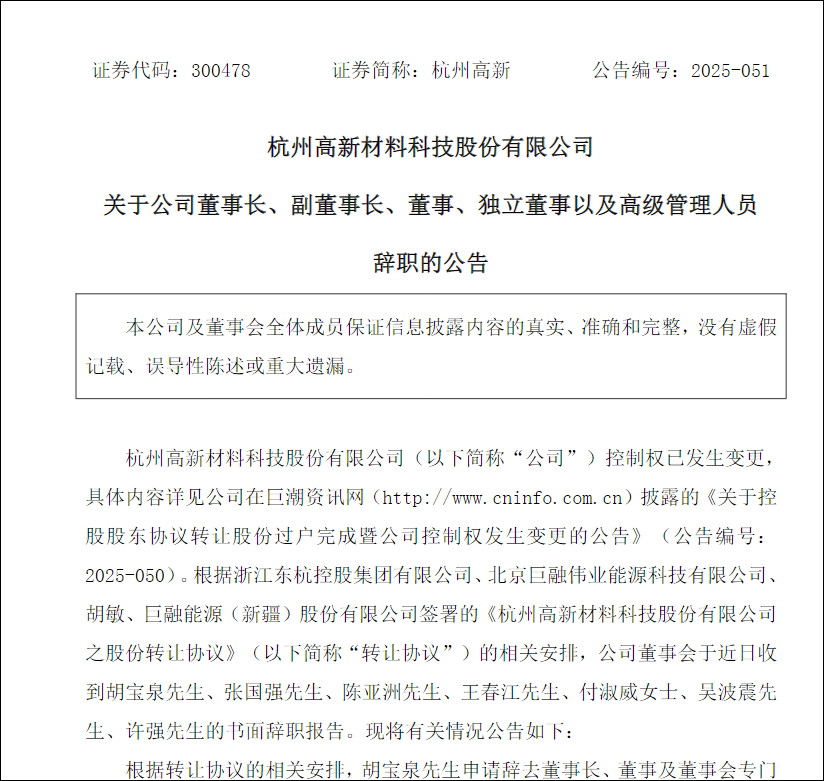 根据转让协议的相关安排,胡宝泉申请辞去董事长、董事及董事会专门委员会相关职务;张国强申请辞去公司副董事长、董事及董事会专门委员会相关职务;陈亚洲申请辞去公司董事、总经理及董事会专门委员会相关职务;王春江申请辞去董事、副总经理、董事会秘书、财务总监及董事会专门委员会相关职务;付淑威、吴波震、许强分别申请辞去独立董事及董事会专门委员会相关职务。